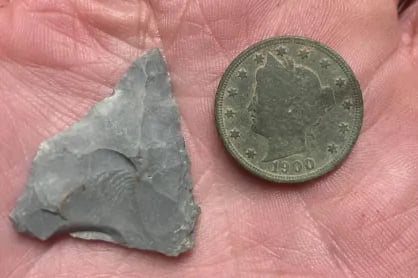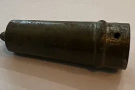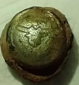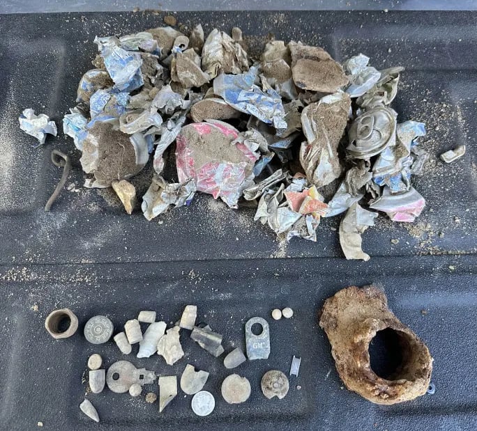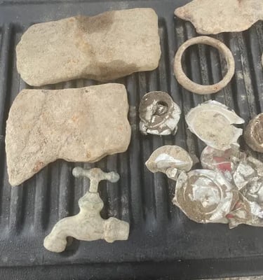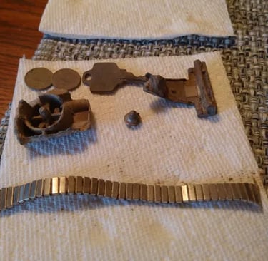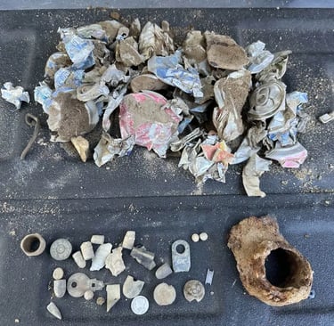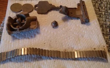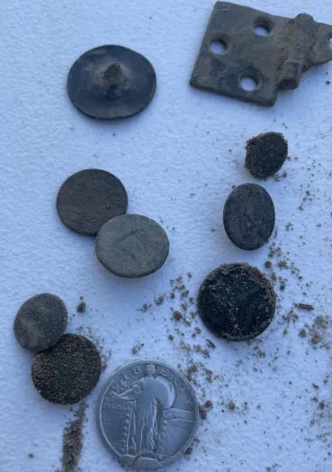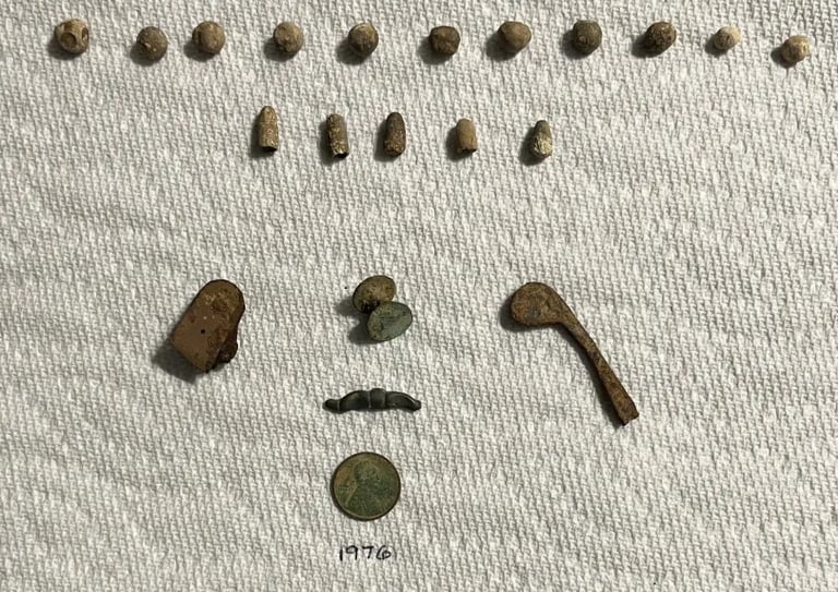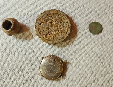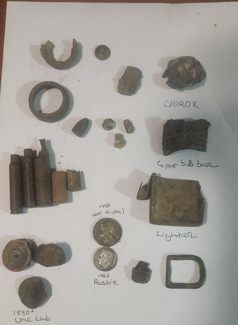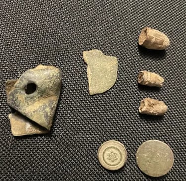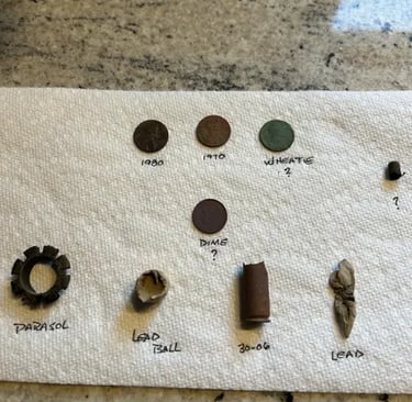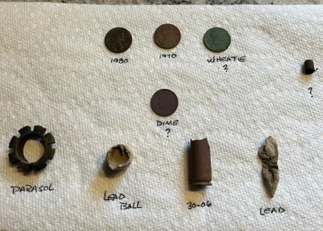 Parasol Cap, Musket ball, 30-06 casing, melted lead, various coins and a civil war percussion cap. Recovered by Brian Bottoms