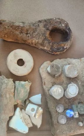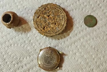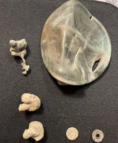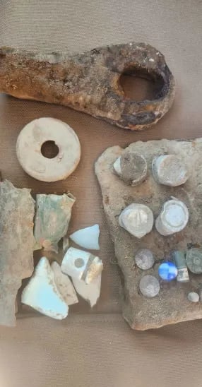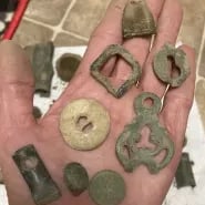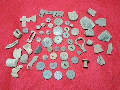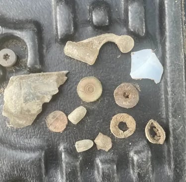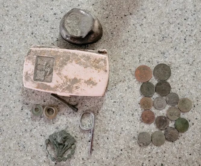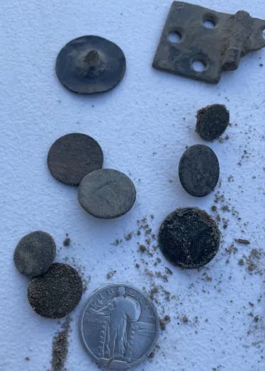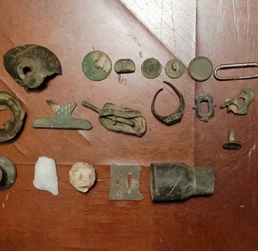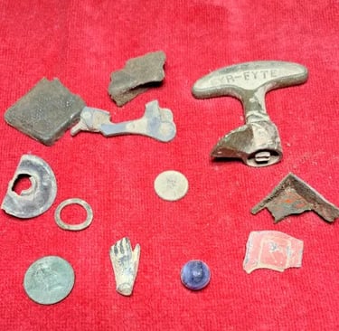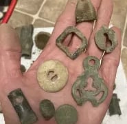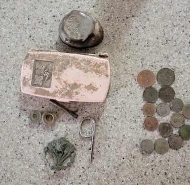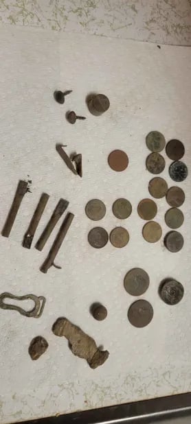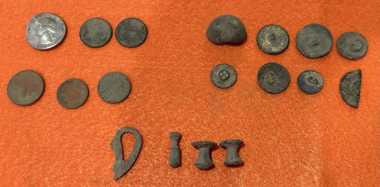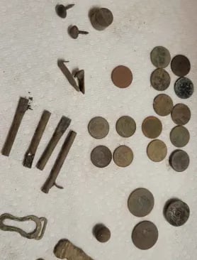 1879 Indian head penny,1944 Wheat cent, Bag seal, 3 buttons and a buckle. Recovered by Gary Wester