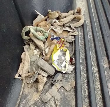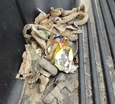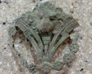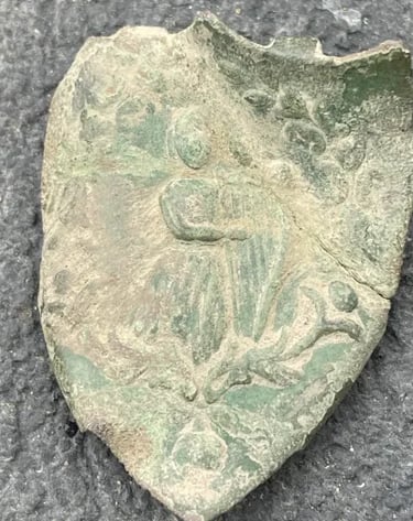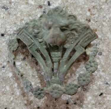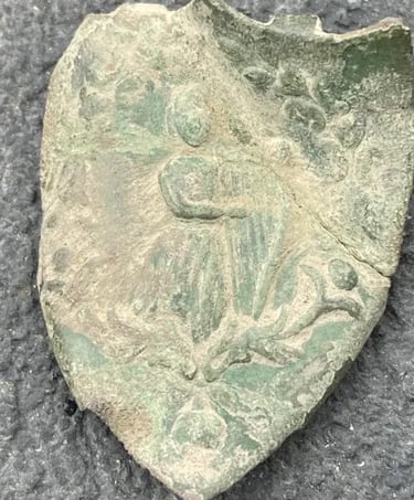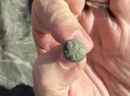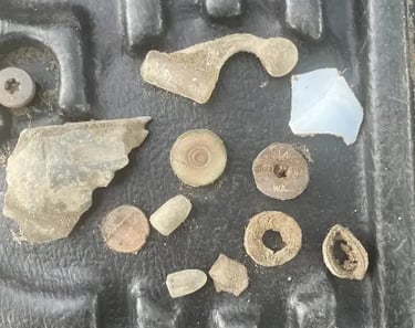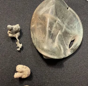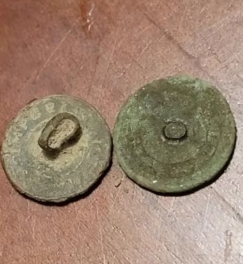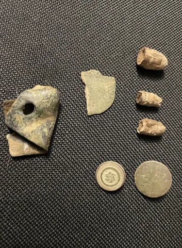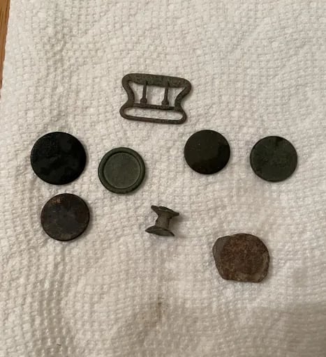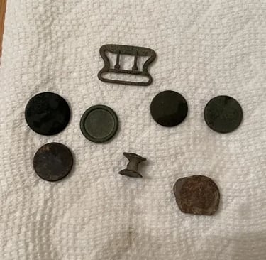 Melted camp lead, and, possibly 2 spent mini balls, 2 flat buttons and a large "I" horse Rossette? Recovered by Thomas Powell