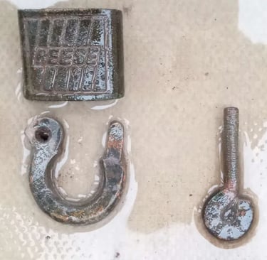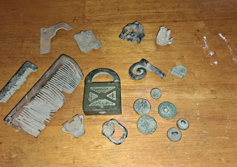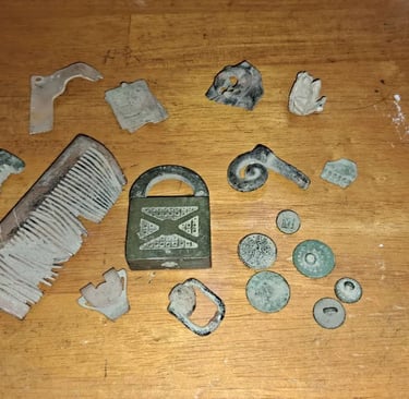 2 Curry Combs. Small buckle,6 buttons, 1890's Slaymaker Lock. Recovered by Steve Blanchard.