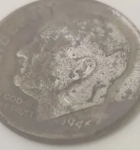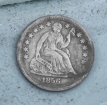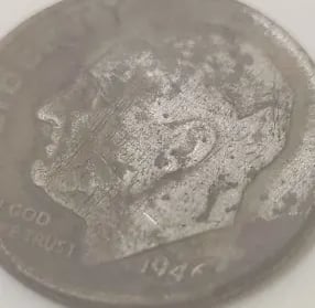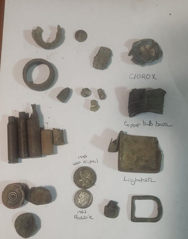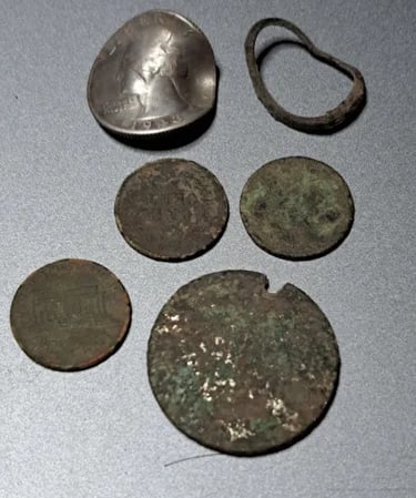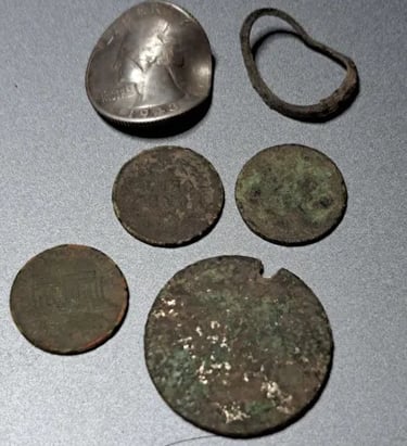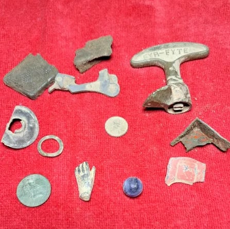1944 Quarter, 1912 wheatie, a 172? 1/4 Re’al, a couple Tombac buttons, a couple musket balls, maybe a carved fishing weight, a pack strap stud, the top of maybe a lipstick tube or possibly a Model A valve stem cover, an interesting piece of lead and several pieces of brass wire. Recovered by Moe McKnight