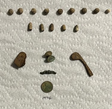 Thimble, D buckle, lead hem/curtain weight, horse tack adornment below the weight, 1943 wheat penny & the piece to the left with the hole is part of a muzzleloader trigger guard. Recovered by Ginny Johnson.