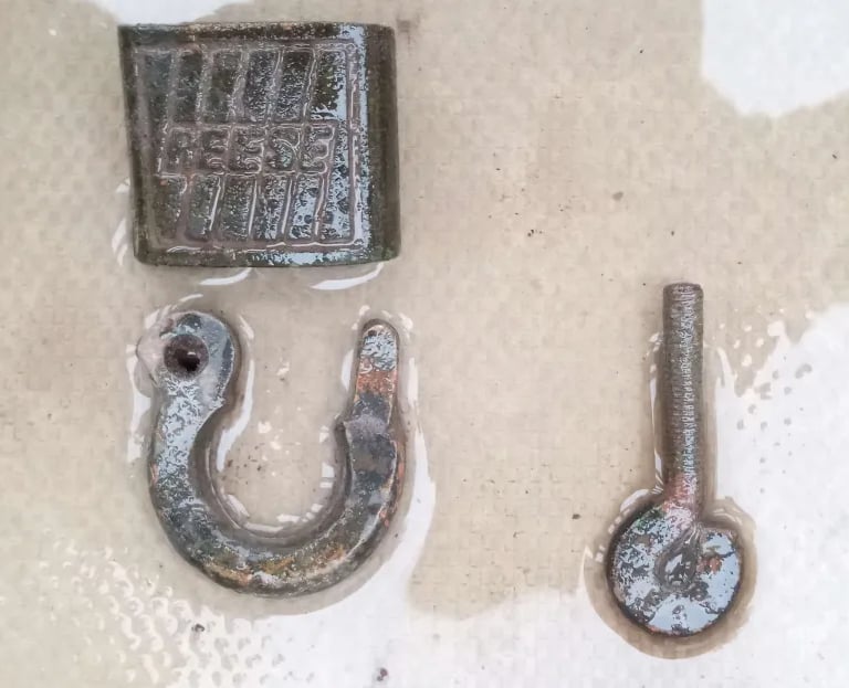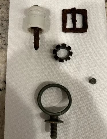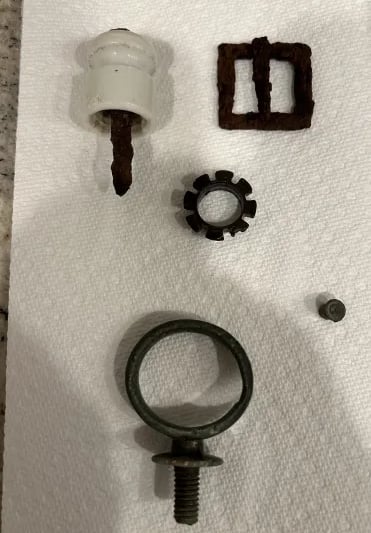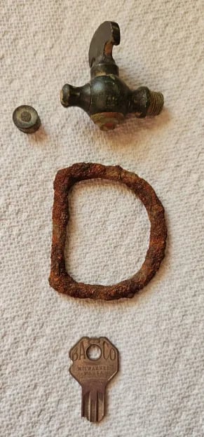 Vintage brass gas valve? D ring buckle, antique key, rivet. Recovered by Mark Armstrong