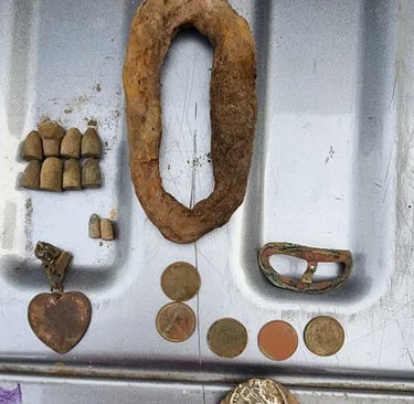 "Playing in the farmers field during a stormy day " recoveries made by Ginny Johnson. Colonial button, pottery shards, Native American arrowheads, Great white shark tooth. Eastern Nc.